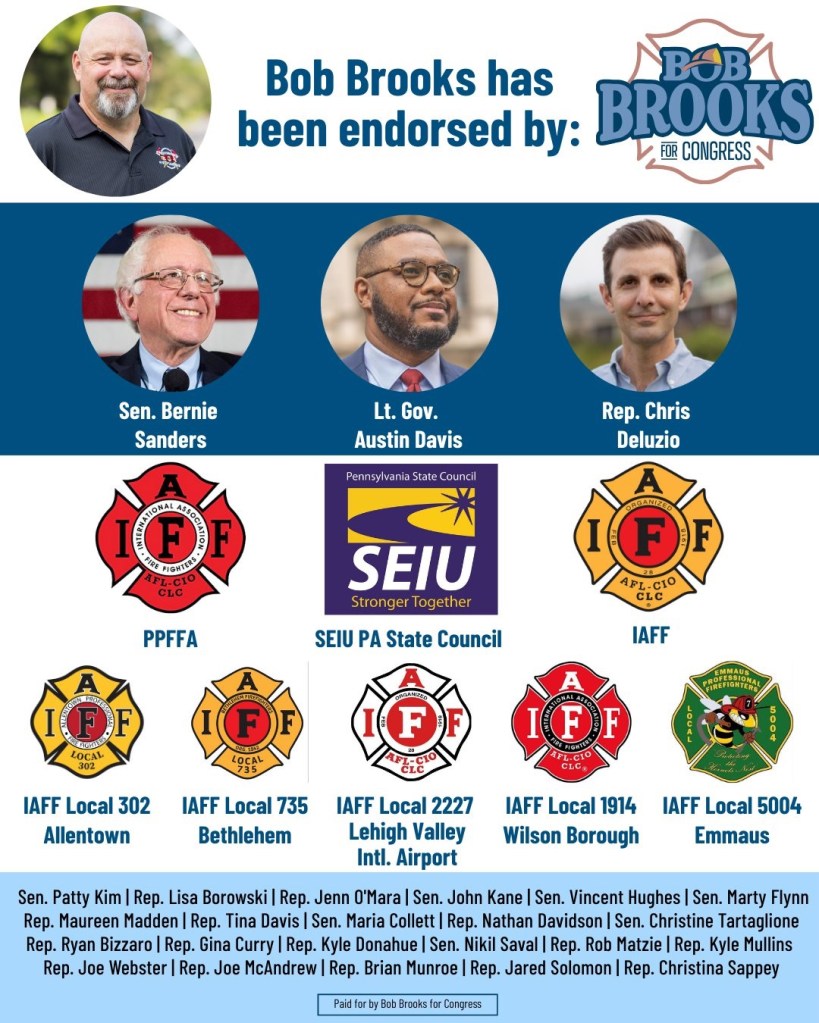 I suppose Bobby found some friends though, as you can see in his graphic above- a bunch of State Legislators who don’t live in the 7th Congressional District. You have Representatives and Senators from as close as Mt. Pocono and Scranton, or Philadelphia and lower Bucks County to the South, and as far as from Harrisburg and west of Pittsburgh, and hell, even Erie. What you don’t see is either Democratic State Senator from the Lehigh Valley. You don’t see any of Allentown’s Democratic State Representatives, either of Bethlehem’s, or the one in Easton. You don’t see the Lehigh County Executive, the former Democratic Congresswoman, or any local Lehigh Valley politician. No one here, who actually has to deal with nominating Bob Brooks actually wants to nominate Bob Brooks. He has a laundry list of Democratic politicians from the rest of the state, all of whom are making the political calculation that it’s good politics to support a statewide union President in some other district. I get it. It’s very misleading though. It’s probably helping him raise money, his campaign is claiming to have raised $100k in the first 24 hours, but I’m sure that’s largely from outside of the Lehigh Valley too, like an other candidate.