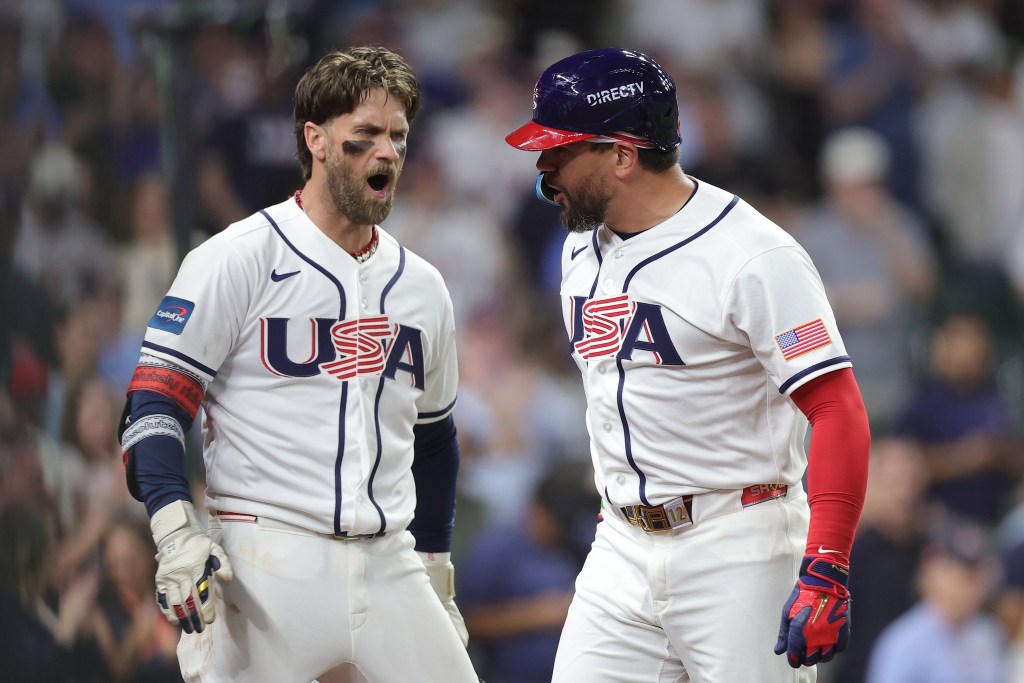 HOUSTON, TEXAS – MARCH 07: Kyle Schwarber #12 of Team United States celebrates his two run home run with teammate Bryce Harper #24 in the fifth inning against Team Great Britain during a 2026 World Baseball Classic Pool B game at Daikin Park on March 07, 2026 in Houston, Texas. (Photo by Alex Slitz/Getty Images)