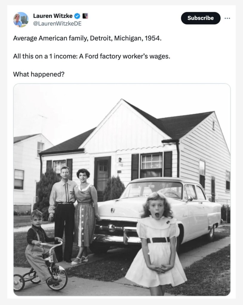 Yes, life was simple and good back then, because you didn’t know better. You didn’t know better, and life improved. Today you live in remarkably better conditions. It’s just that ten years from now your life will not naturally be so dramatically better than it is today. You’ll have better technology, more access to data and information, and better services available to you- but we’re not going to make poor people billionaires without inflation, or solve how to beat death, or end everything wrong in our world. We’re just going to keep marginally improving, with an occasional breakthrough that accelerates improvements and alleviates pain. I think it’s perfectly fine to point out how our society’s growth over the last 70 years has had flaws- the loss of union jobs, the rise of climate change, the rise of divorcees and co-parenting, mental health issues and mass shootings rising, and on and on. Those things aren’t great, and yes, both the government and the market need to help fix them. But they are.